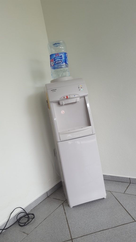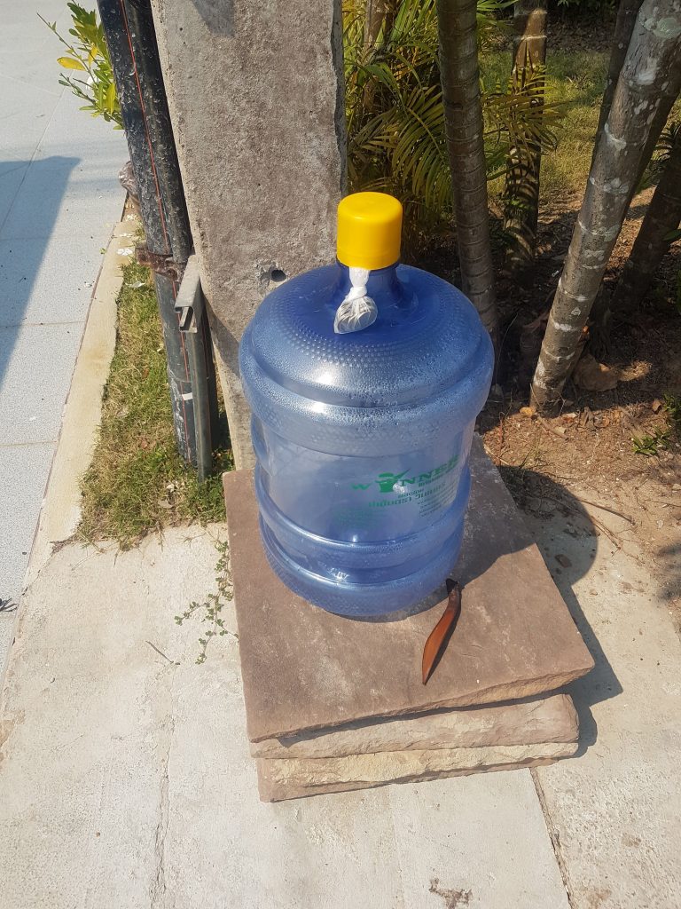 I köket finns en vattenautomat som laddas med 18L-dunkar. Dunkarna (iWater) kostar 20 THB när man byter sin tomma mot en full. Vattenbilen kommer på torsdagar, man ställer ut sin tomma flaska vid elstolpen och hänger på en påse med 20 THB så byts den mot en full.